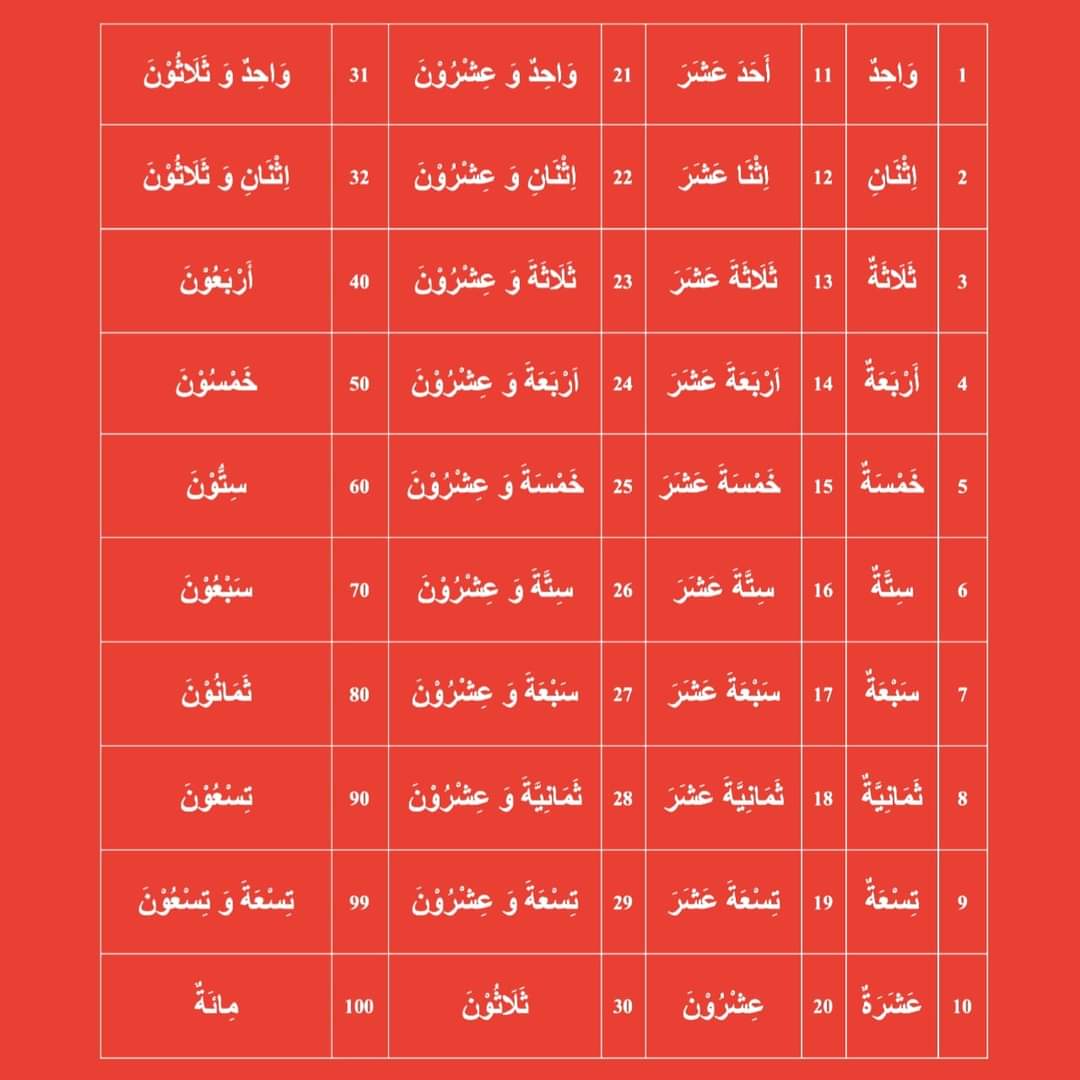 Sedangkan bilangan tingkat adalah angka yang menunjukkan urutan, contohnya: pertama, kedua, ketiga. Ada beberapa ketentuan yang harus diperhatikan dalam penggunaan angka pada bahasa Arab. Namun sebelum mempelajari lebih lanjut, ada baiknya jika Anda mengetahui terlebih dahulu bahasa Arab angka 1-20 di bawah ini. Belajar angka bahasa arab 1-100 lengkap dengan kaidah dan cara membacanya, yuk kita simak penjelasan berikut ini. Bahasa Arab memiliki keunikan terutama dalam hukum bilangan. Peraturan dalam membilang angka berbasa arab setidaknya perlu memperhatikan 4 hal yaitu: Hukum Mudzakkar & Muannatsnya, Hukum Tamyiznya/Ma'dudnya dan Hukum I'robnya. Empat hal yang mendasari hukum bilangan 1-3 (satu.
